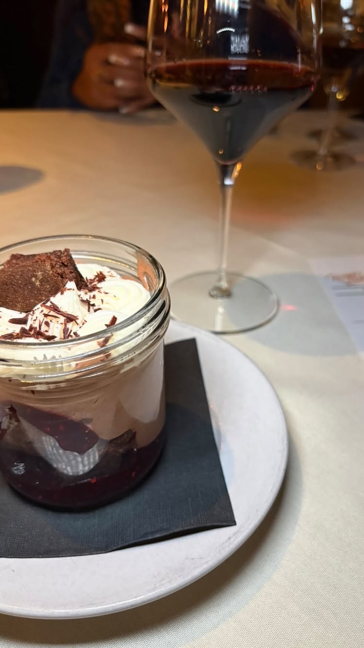 Chocolate Trifle With Cinnamon Dark Chocolate Brownie, Raspberry Jam, Chocolate Mousse, Chantilly Cream, Topped With Dark Chocolate ShavingsChocolate TrifleCinnamon Dark Chocolate BrownieRaspberry JamChocolate MousseChantilly CreamDark Chocolate Shavings