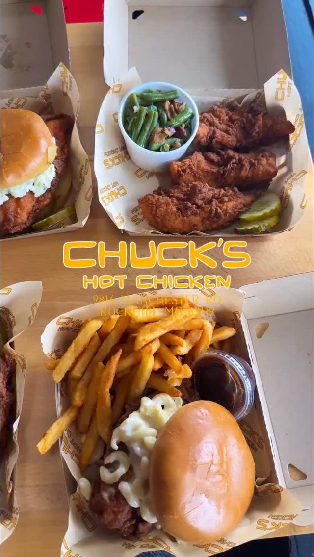 Nashville Hot ChickenBBQ Mac Chicken Sandwichchicken stripscheese curdsbuttermilk ranchChuck's dipping sauce