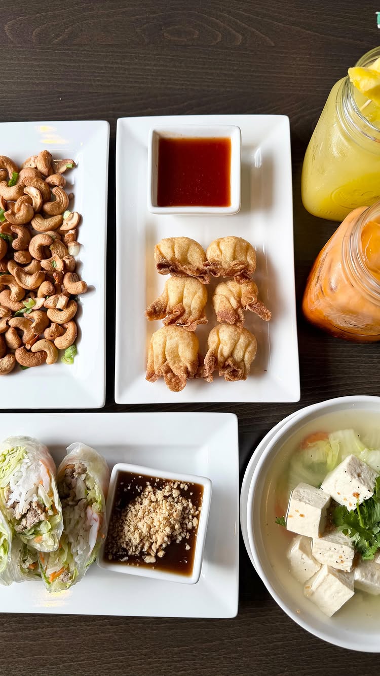 Fresh Thai Spring Rolls with Pork and ShrimpFried Cream Cheese PuffsTofu SoupFried CashewsStir-fried Mix Vegetables with ChickenYellow Curry with BeefPad See Yew with ChickenPineapple Chicken Fried RiceThai Iced Tea