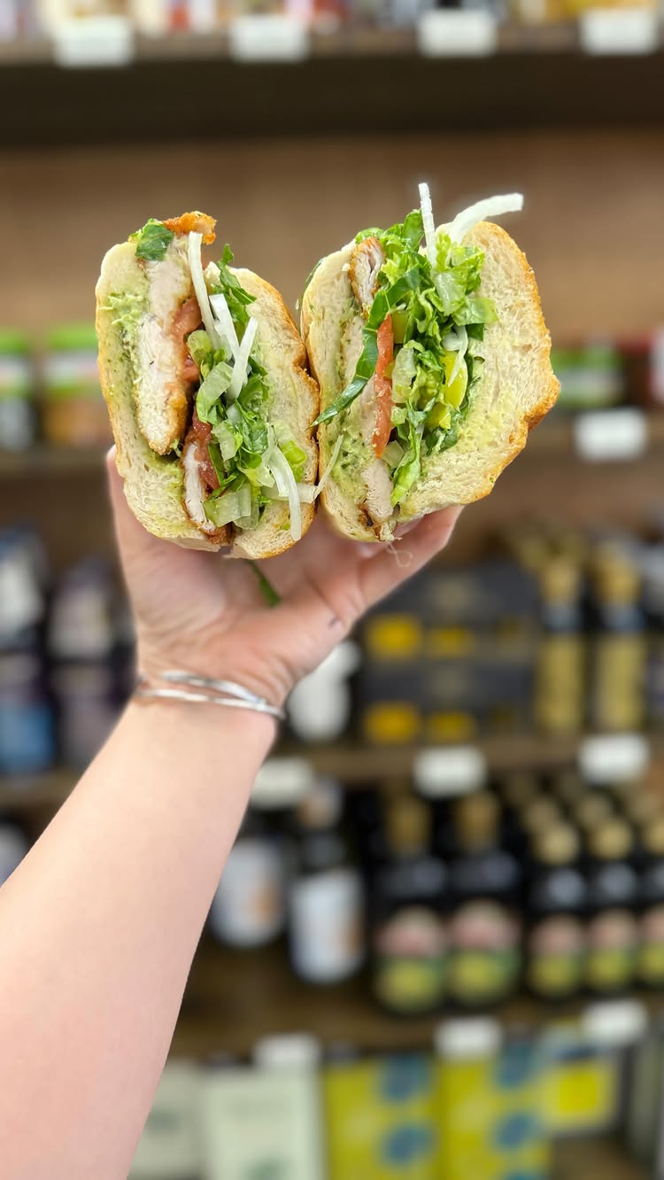 Competition Sandwich With Chicken Cutlets, Pesto, Lettuce, Tomato, Onion, And Hot Peppers On Homemade BreadItalian SodasOlive OilsItalian Baked GoodsPastaCompetition Sandwich