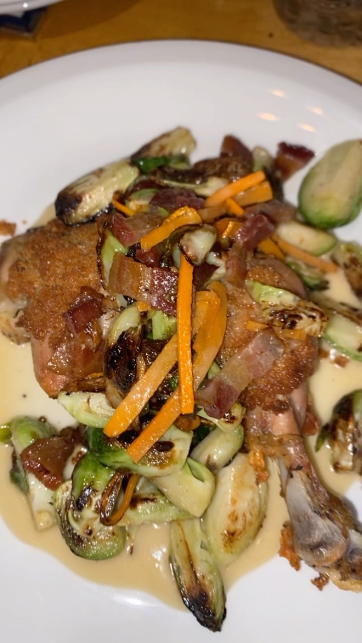 Chicken Leg ConfitBrioche crumbleBrussels sprout-carrot-bacon salad