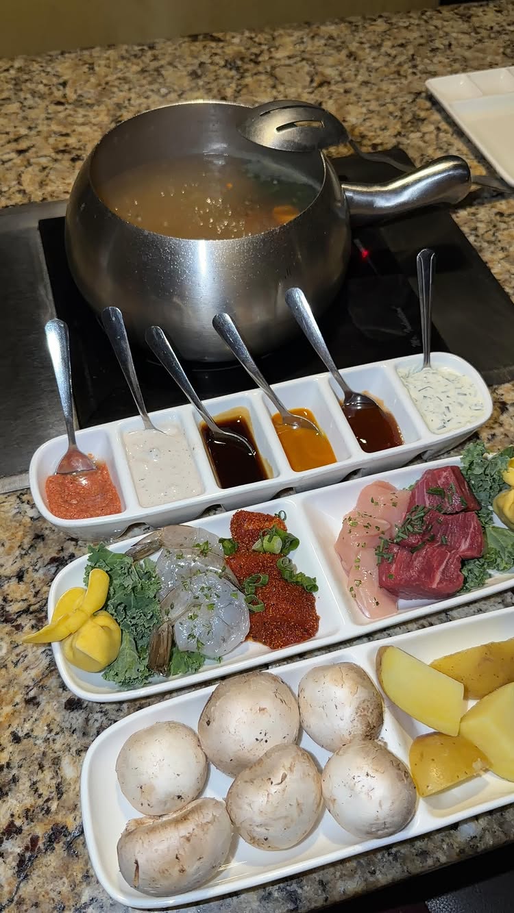 Milk Chocolate Fondue With Fruit And CakeMilk Chocolate FondueHatch Green Chile Cheddar Cheese Fondue With ApplesMemphis Rubbed Pork, Shrimp, Chicken, Andouille Sausage EntreeHatch Green Chile Cheddar Cheese FondueMemphis Rubbed PorkShrimpChickenAndouille SausagePasta