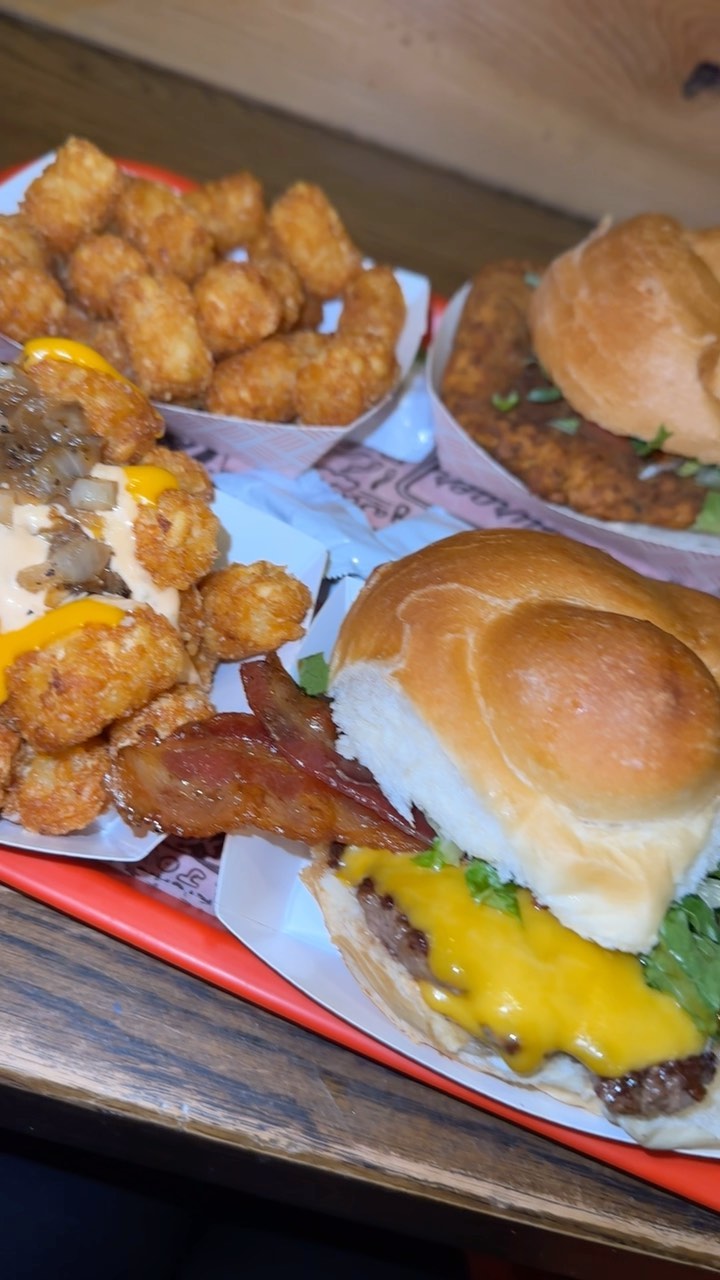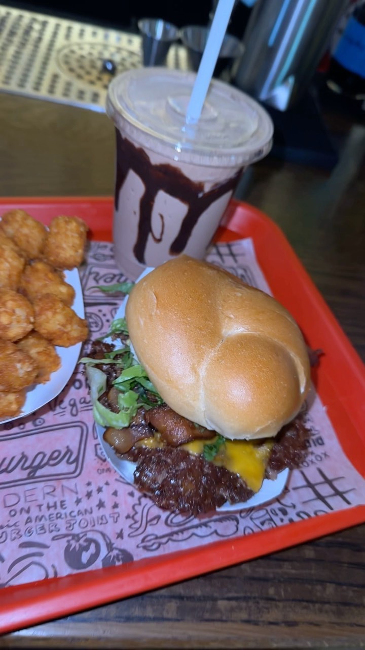 There is literally nothing better than a smash burger, cajun tots, and a chocolate milkshake.