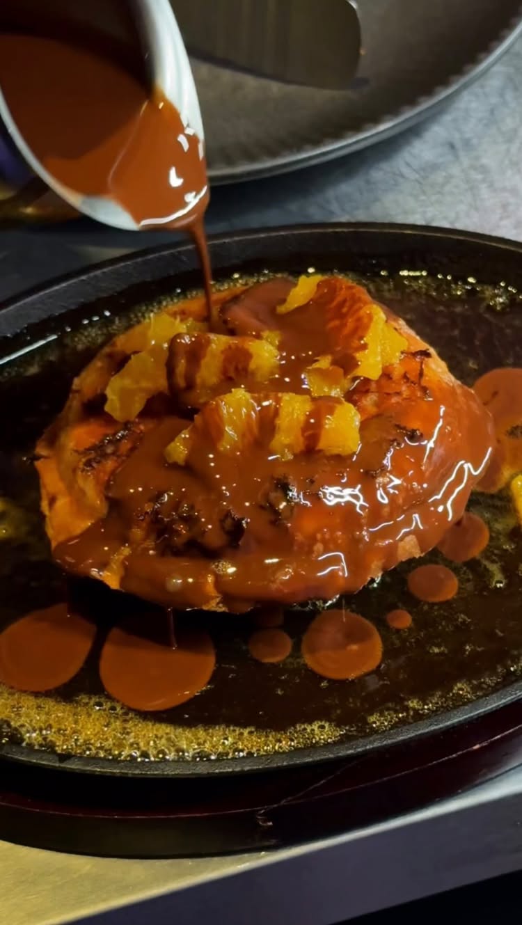 the incredible orange chocolate lava toast served table side on top of sizzling orange marmalade.