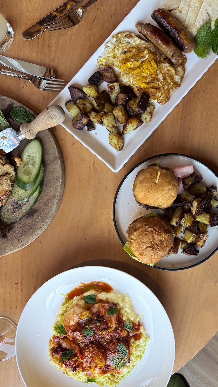 Shrimp Saganaki with polentaMoroccan Beef Slidersclassic breakfast of eggs, sausage and potatoesStardust cocktailPaper Plane cocktail