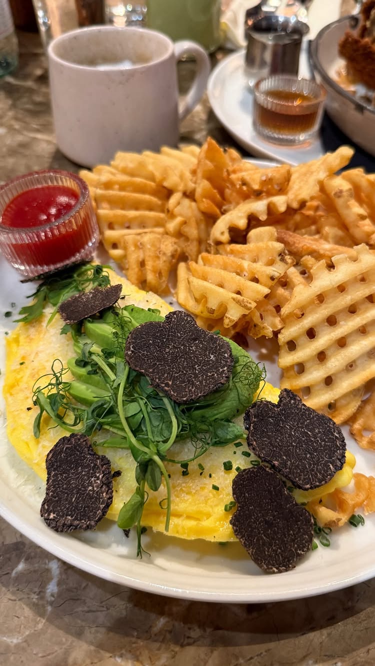 caviar bumpschicken and donutsKing Crab Benedictfrench omelet with truffle shavings